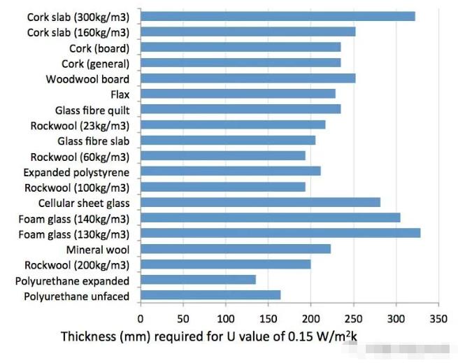 不同保溫材料在同等保溫傳熱系數(shù)目標下的厚度對比