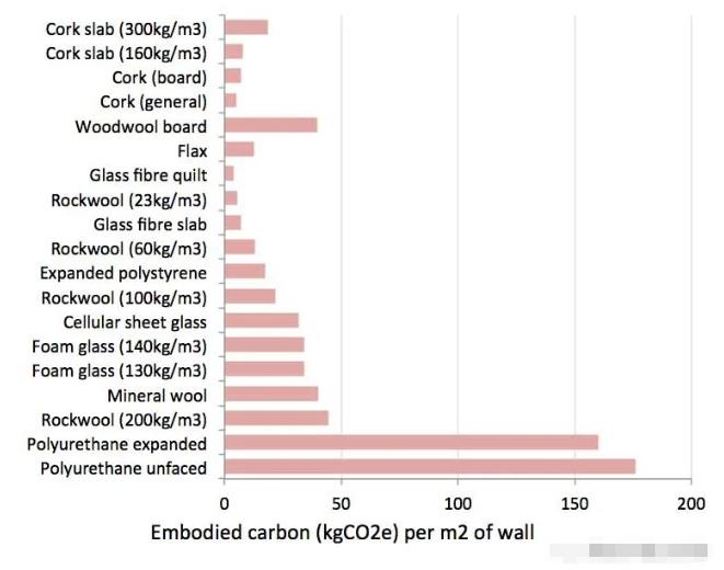 上面的表圖,但從厚度角度,肯定是厚度越厚,體積越大。我們下面來對比材料的隱含碳排放。隱含碳是指任何一種產(chǎn)品的生產(chǎn),都會直接或間接地產(chǎn)生碳排放,為了得到某種產(chǎn)品,而在整個生產(chǎn)鏈中所排放的二氧化碳。那么,越是那些化工產(chǎn)品,可能經(jīng)過了很多工藝,引起的隱含碳就越高。越是依靠天然材料就能加工制作的材料,其隱含碳就越少。下面這個就是各種保溫材料的隱含碳對比
